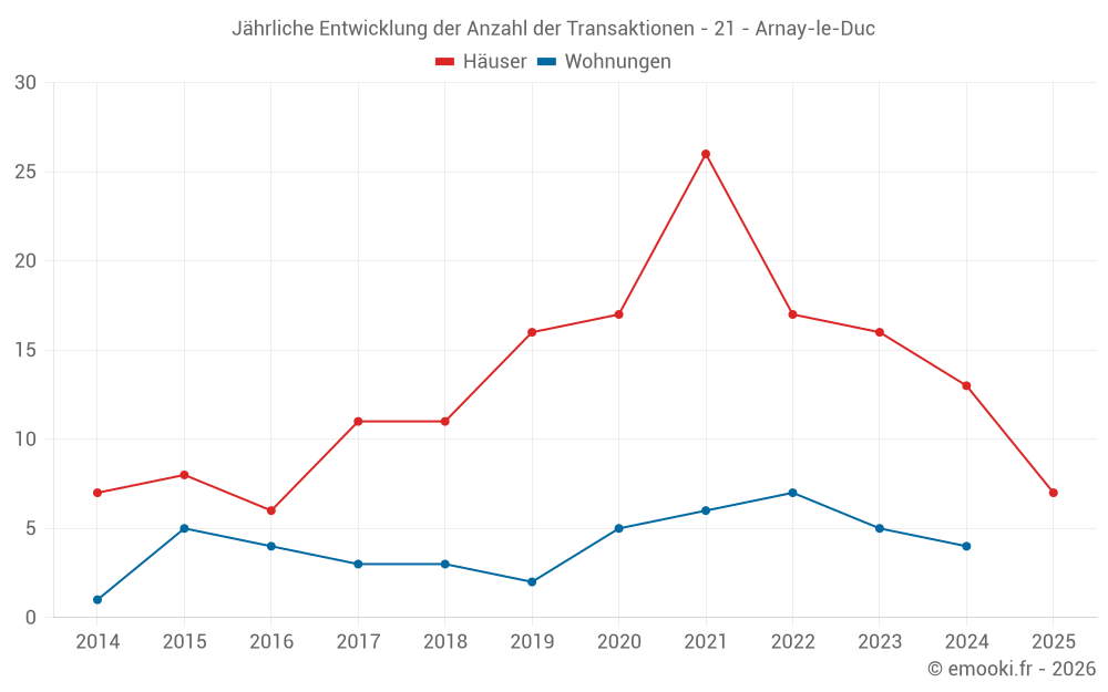 Der Durchschnittspreis auf den 26 Hausgeschäften der letzten 24 Monate in der Gemeinde Arnay-le-Duc betrug 907 € pro Quadratmeter für einen mittleren Immobilienwert von 85 886 €. Über diesen Zeitraum hinweg lagen 60% der Transaktionen zwischen 694 und 1 500 € pro Quadratmeter (vom 2. bis zum 8. Dezil).