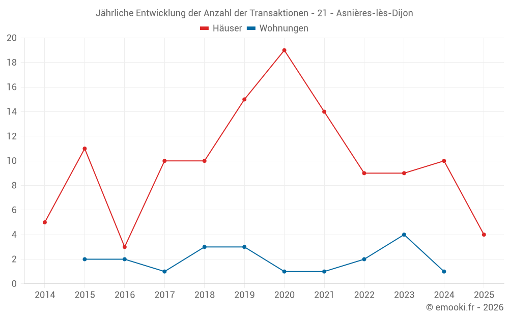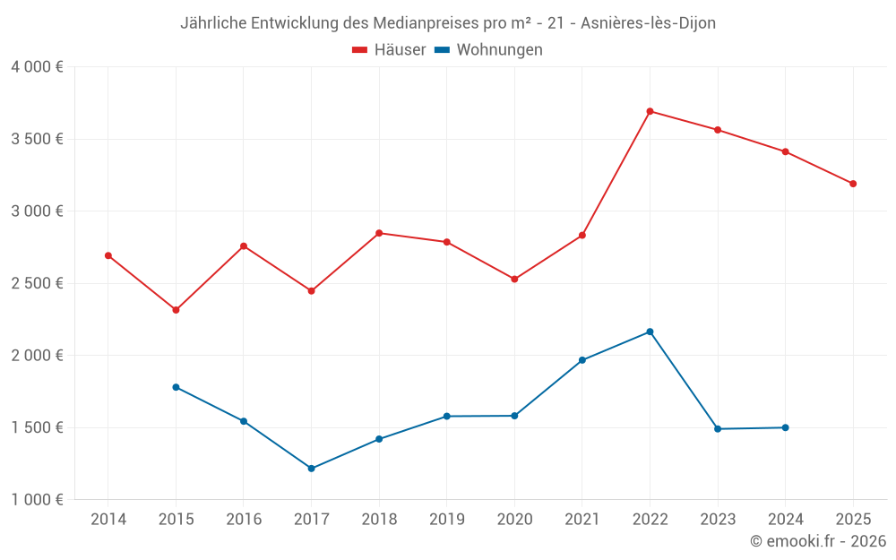 Der Durchschnittspreis auf den 17 Hausgeschäften der letzten 24 Monate in der Gemeinde Asnières-lès-Dijon betrug 3 360 € pro Quadratmeter für einen mittleren Immobilienwert von 453 000 €. Über diesen Zeitraum hinweg lagen 60% der Transaktionen zwischen 2 729 und 3 718 € pro Quadratmeter (vom 2. bis zum 8. Dezil).