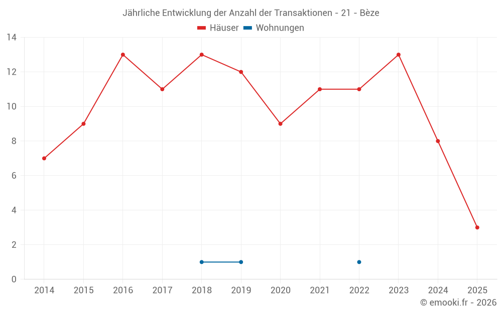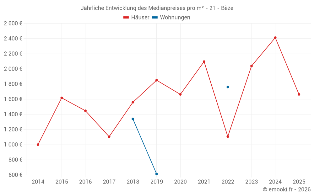 Der Durchschnittspreis auf den 16 Hausgeschäften der letzten 24 Monate in der Gemeinde Bèze betrug 2 374 € pro Quadratmeter für einen mittleren Immobilienwert von 212 250 €. Über diesen Zeitraum hinweg lagen 60% der Transaktionen zwischen 1 609 und 2 904 € pro Quadratmeter (vom 2. bis zum 8. Dezil).
