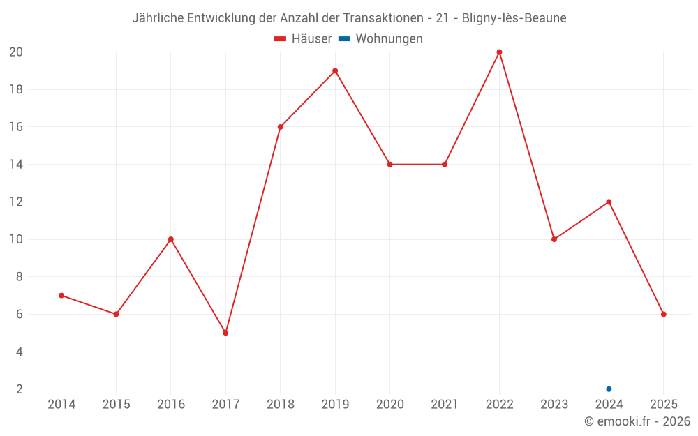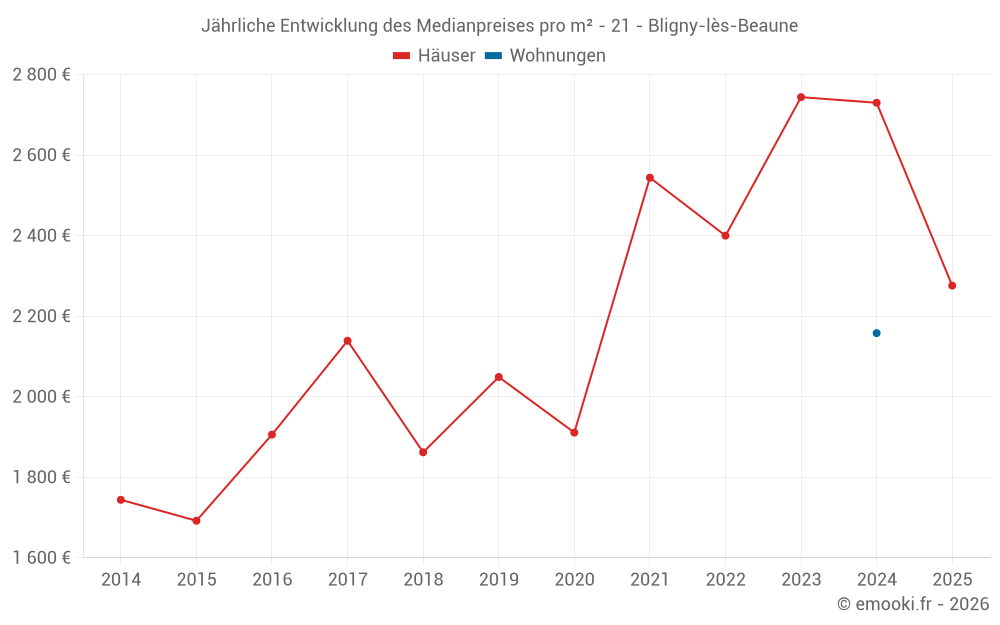 Der Durchschnittspreis auf den 24 Hausgeschäften der letzten 24 Monate in der Gemeinde Bligny-lès-Beaune betrug 2 621 € pro Quadratmeter für einen mittleren Immobilienwert von 240 865 €. Über diesen Zeitraum hinweg lagen 60% der Transaktionen zwischen 1 940 und 3 210 € pro Quadratmeter (vom 2. bis zum 8. Dezil).