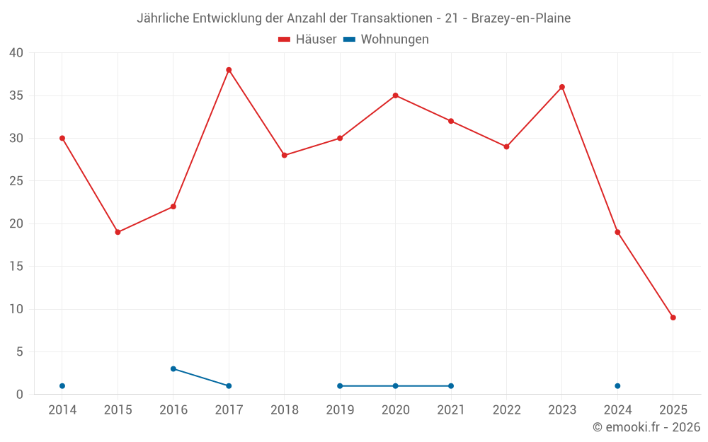 Der Durchschnittspreis auf den 20 Hausgeschäften der letzten 12 Monate in der Gemeinde Brazey-en-Plaine betrug 1 980 € pro Quadratmeter für einen mittleren Immobilienwert von 189 250 €. Über diesen Zeitraum hinweg lagen 60% der Transaktionen zwischen 1 604 und 2 170 € pro Quadratmeter (vom 2. bis zum 8. Dezil).