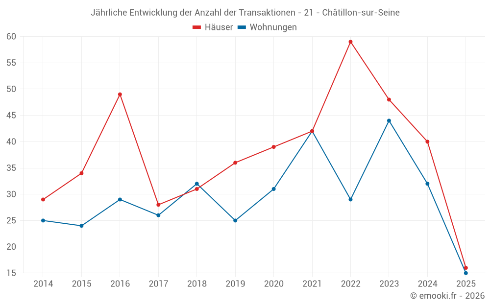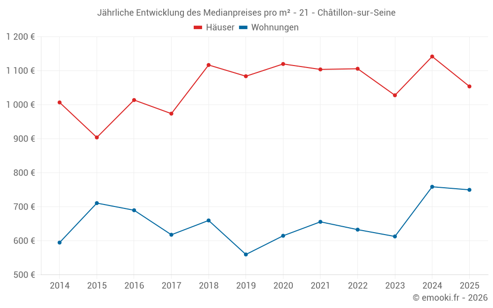 Der Durchschnittspreis auf den 35 Hausgeschäften der letzten 12 Monate in der Gemeinde Châtillon-sur-Seine betrug 1 105 € pro Quadratmeter für einen mittleren Immobilienwert von 115 000 €. Über diesen Zeitraum hinweg lagen 60% der Transaktionen zwischen 743 und 1 430 € pro Quadratmeter (vom 2. bis zum 8. Dezil).