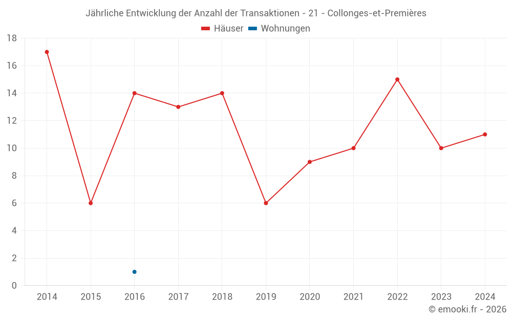 Der Durchschnittspreis auf den 16 Hausgeschäften der letzten 24 Monate in der Gemeinde Collonges-et-Premières betrug 2 253 € pro Quadratmeter für einen mittleren Immobilienwert von 232 250 €. Über diesen Zeitraum hinweg lagen 60% der Transaktionen zwischen 2 056 und 2 632 € pro Quadratmeter (vom 2. bis zum 8. Dezil).