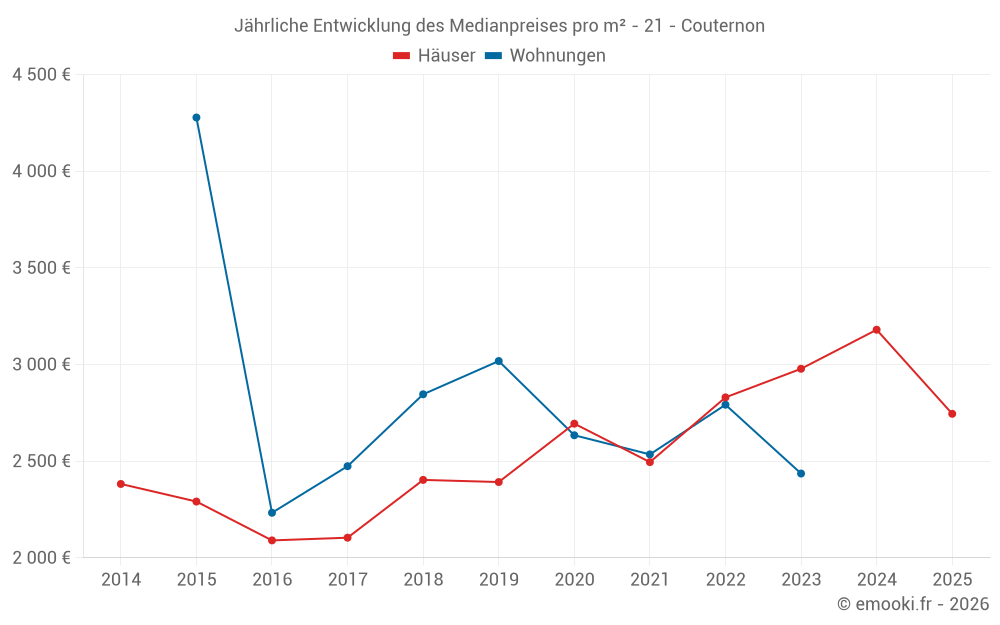 Der Durchschnittspreis auf den 19 Hausgeschäften der letzten 24 Monate in der Gemeinde Couternon betrug 2 962 € pro Quadratmeter für einen mittleren Immobilienwert von 300 000 €. Über diesen Zeitraum hinweg lagen 60% der Transaktionen zwischen 2 401 und 3 684 € pro Quadratmeter (vom 2. bis zum 8. Dezil).