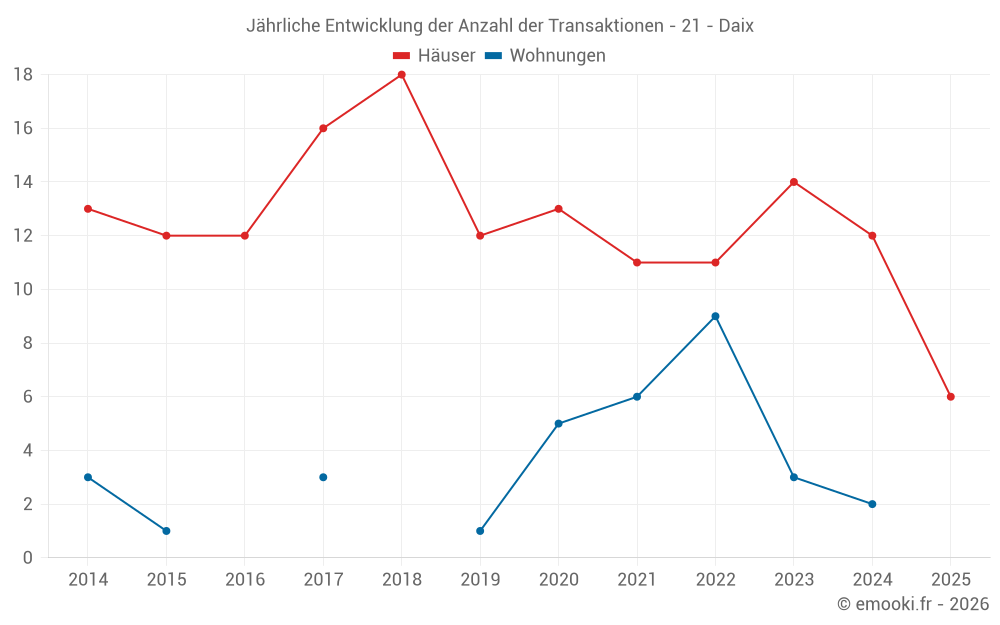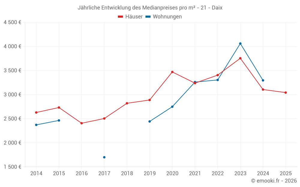 Der Durchschnittspreis auf den 28 Hausgeschäften der letzten 24 Monate in der Gemeinde Daix betrug 3 264 € pro Quadratmeter für einen mittleren Immobilienwert von 426 000 €. Über diesen Zeitraum hinweg lagen 60% der Transaktionen zwischen 2 955 und 4 047 € pro Quadratmeter (vom 2. bis zum 8. Dezil).