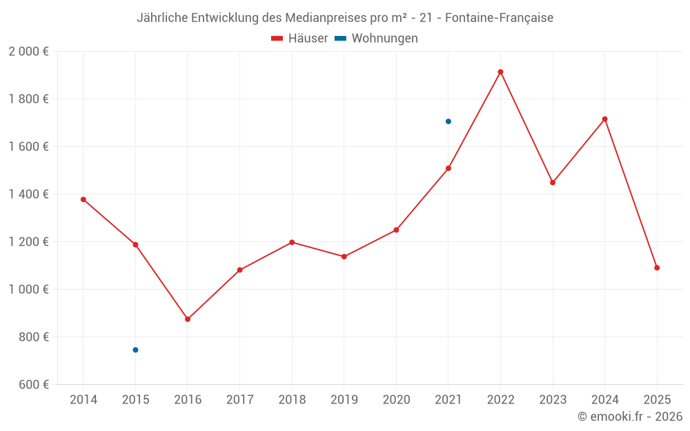 Der Durchschnittspreis auf den 21 Hausgeschäften der letzten 24 Monate in der Gemeinde Fontaine-Française betrug 1 666 € pro Quadratmeter für einen mittleren Immobilienwert von 109 500 €. Über diesen Zeitraum hinweg lagen 60% der Transaktionen zwischen 1 091 und 1 982 € pro Quadratmeter (vom 2. bis zum 8. Dezil).