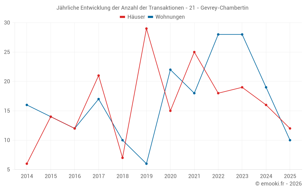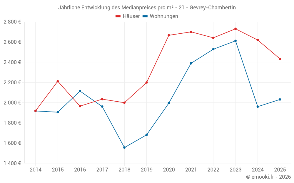 Der Durchschnittspreis auf den 20 Hausgeschäften der letzten 12 Monate in der Gemeinde Gevrey-Chambertin betrug 2 454 € pro Quadratmeter für einen mittleren Immobilienwert von 263 905 €. Über diesen Zeitraum hinweg lagen 60% der Transaktionen zwischen 1 735 und 3 191 € pro Quadratmeter (vom 2. bis zum 8. Dezil).