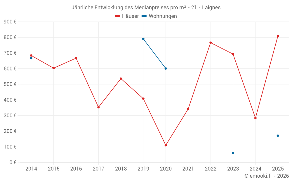 Der Durchschnittspreis auf den 26 Hausgeschäften der letzten 24 Monate in der Gemeinde Laignes betrug 562 € pro Quadratmeter für einen mittleren Immobilienwert von 54 775 €. Über diesen Zeitraum hinweg lagen 60% der Transaktionen zwischen 184 und 870 € pro Quadratmeter (vom 2. bis zum 8. Dezil).