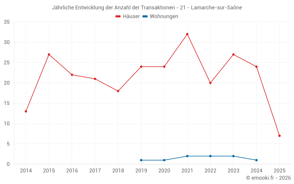 Der Durchschnittspreis auf den 22 Hausgeschäften der letzten 12 Monate in der Gemeinde Lamarche-sur-Saône betrug 1 857 € pro Quadratmeter für einen mittleren Immobilienwert von 127 500 €. Über diesen Zeitraum hinweg lagen 60% der Transaktionen zwischen 1 066 und 2 375 € pro Quadratmeter (vom 2. bis zum 8. Dezil).