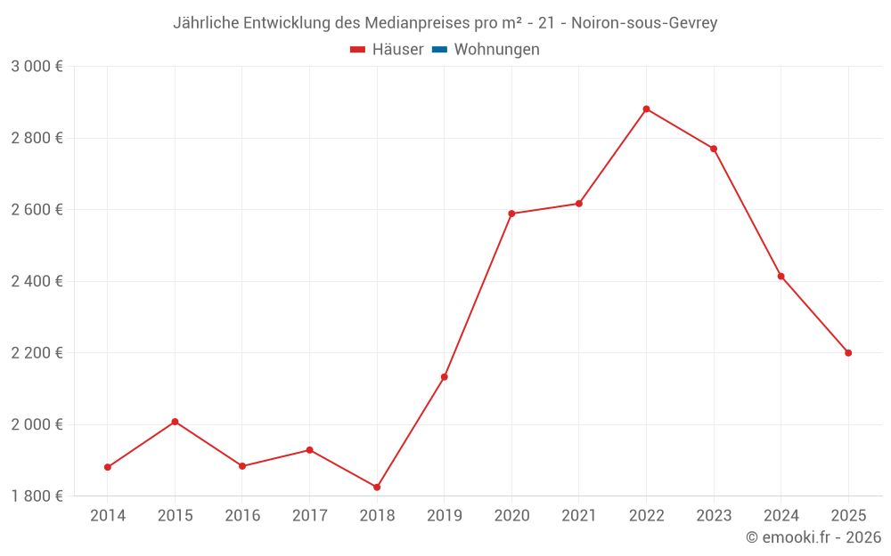 Der Durchschnittspreis auf den 19 Hausgeschäften der letzten 24 Monate in der Gemeinde Noiron-sous-Gevrey betrug 2 548 € pro Quadratmeter für einen mittleren Immobilienwert von 248 550 €. Über diesen Zeitraum hinweg lagen 60% der Transaktionen zwischen 1 943 und 2 828 € pro Quadratmeter (vom 2. bis zum 8. Dezil).