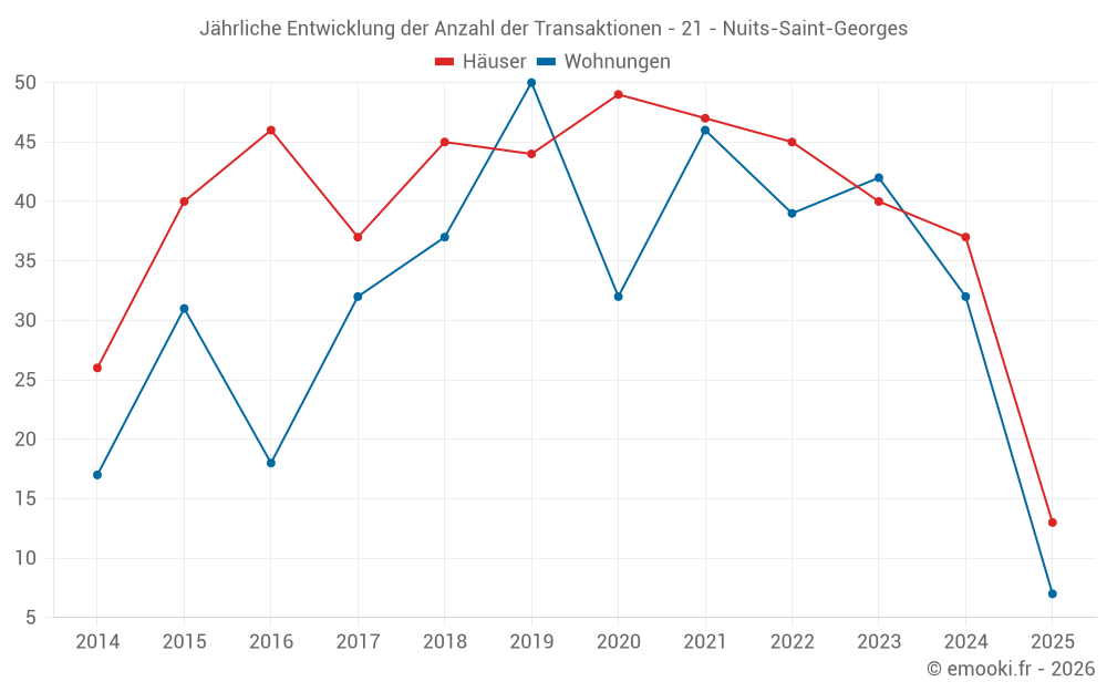 Der Durchschnittspreis auf den 36 Hausgeschäften der letzten 12 Monate in der Gemeinde Nuits-Saint-Georges betrug 2 360 € pro Quadratmeter für einen mittleren Immobilienwert von 230 000 €. Über diesen Zeitraum hinweg lagen 60% der Transaktionen zwischen 1 500 und 2 741 € pro Quadratmeter (vom 2. bis zum 8. Dezil).