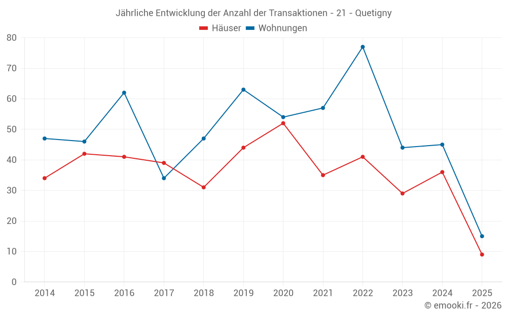 Der Durchschnittspreis auf den 30 Hausgeschäften der letzten 12 Monate in der Gemeinde Quetigny betrug 2 702 € pro Quadratmeter für einen mittleren Immobilienwert von 253 250 €. Über diesen Zeitraum hinweg lagen 60% der Transaktionen zwischen 2 412 und 2 856 € pro Quadratmeter (vom 2. bis zum 8. Dezil).
