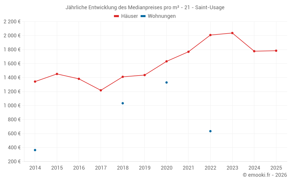 Der Durchschnittspreis auf den 21 Hausgeschäften der letzten 24 Monate in der Gemeinde Saint-Usage betrug 1 784 € pro Quadratmeter für einen mittleren Immobilienwert von 210 000 €. Über diesen Zeitraum hinweg lagen 60% der Transaktionen zwischen 1 400 und 2 072 € pro Quadratmeter (vom 2. bis zum 8. Dezil).