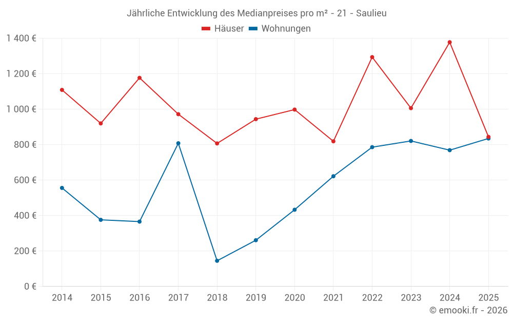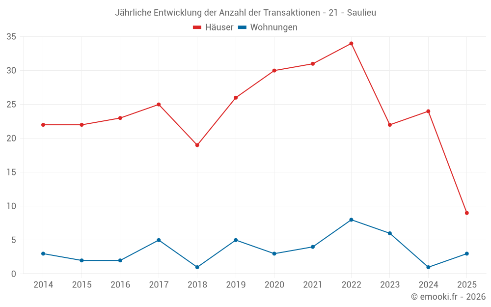 Der Durchschnittspreis auf den 21 Hausgeschäften der letzten 12 Monate in der Gemeinde Saulieu betrug 1 176 € pro Quadratmeter für einen mittleren Immobilienwert von 100 000 €. Über diesen Zeitraum hinweg lagen 60% der Transaktionen zwischen 733 und 1 585 € pro Quadratmeter (vom 2. bis zum 8. Dezil).