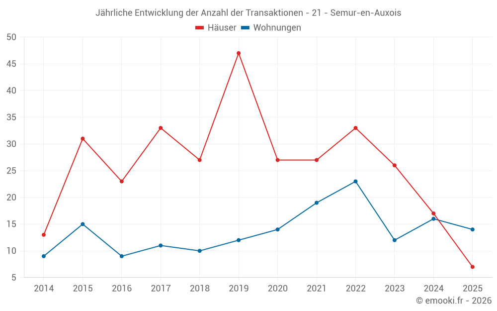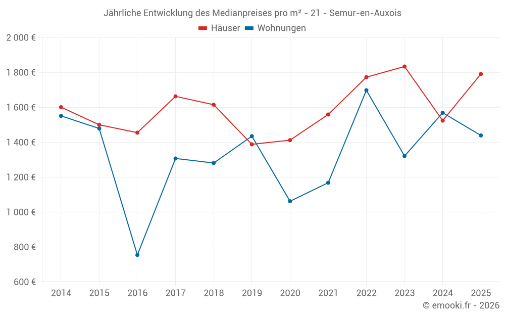 Der Durchschnittspreis auf den 22 Wohnungstransaktionen der letzten 12 Monate in der Gemeinde Semur-en-Auxois betrug 1 614 € pro Quadratmeter für einen mittleren Immobilienwert von 85 000 €. Über diesen Zeitraum hinweg lagen 60% der Transaktionen zwischen 1 333 und 1 874 € pro Quadratmeter (vom 2. bis zum 8. Dezil).