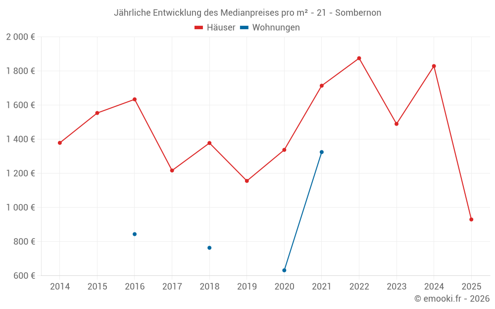 Der Durchschnittspreis auf den 16 Hausgeschäften der letzten 24 Monate in der Gemeinde Sombernon betrug 1 242 € pro Quadratmeter für einen mittleren Immobilienwert von 156 000 €. Über diesen Zeitraum hinweg lagen 60% der Transaktionen zwischen 875 und 2 086 € pro Quadratmeter (vom 2. bis zum 8. Dezil).