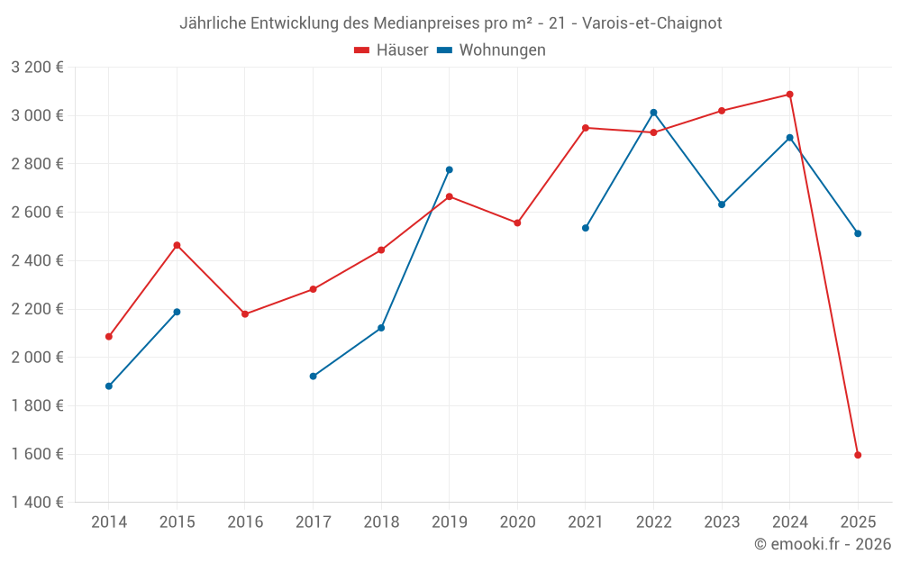 Der Durchschnittspreis auf den 26 Hausgeschäften der letzten 24 Monate in der Gemeinde Varois-et-Chaignot betrug 2 970 € pro Quadratmeter für einen mittleren Immobilienwert von 343 500 €. Über diesen Zeitraum hinweg lagen 60% der Transaktionen zwischen 2 350 und 3 382 € pro Quadratmeter (vom 2. bis zum 8. Dezil).