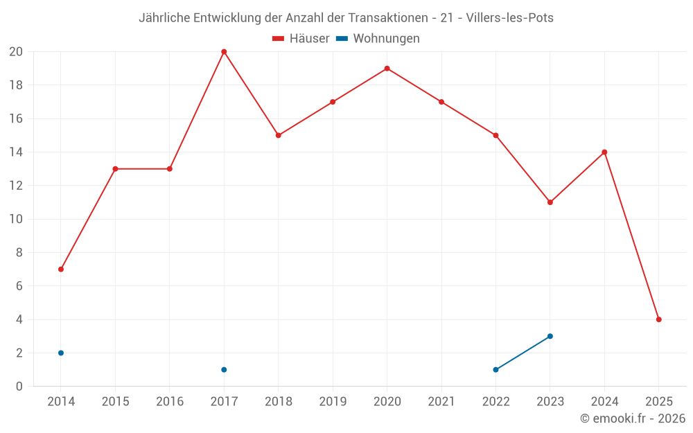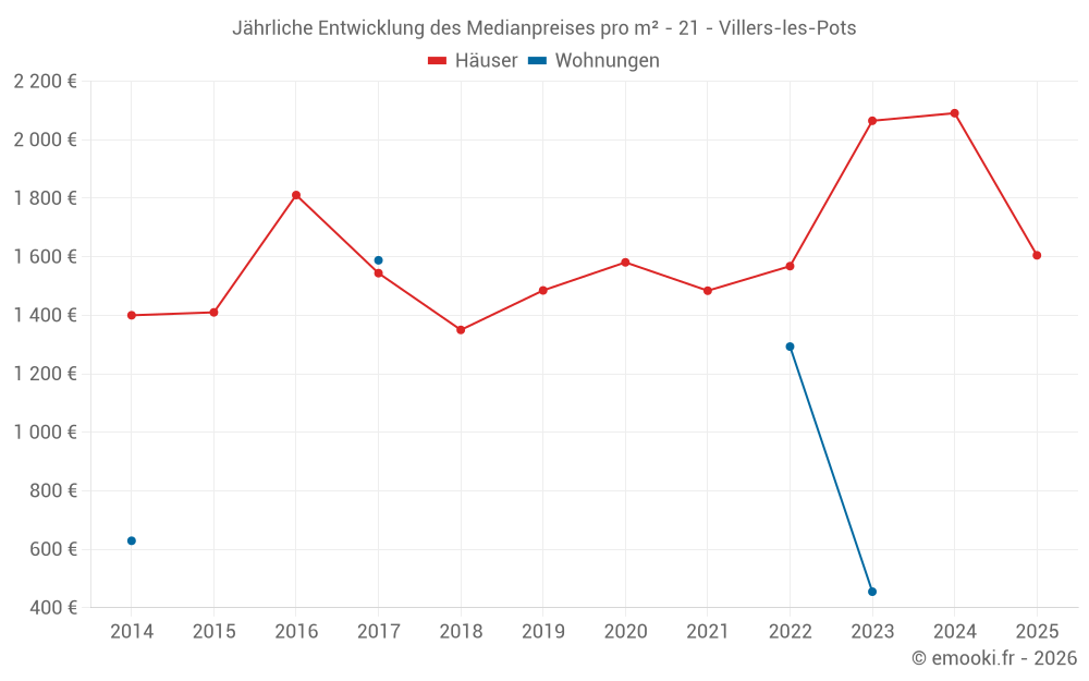 Der Durchschnittspreis auf den 22 Hausgeschäften der letzten 24 Monate in der Gemeinde Villers-les-Pots betrug 1 802 € pro Quadratmeter für einen mittleren Immobilienwert von 175 000 €. Über diesen Zeitraum hinweg lagen 60% der Transaktionen zwischen 1 191 und 2 371 € pro Quadratmeter (vom 2. bis zum 8. Dezil).