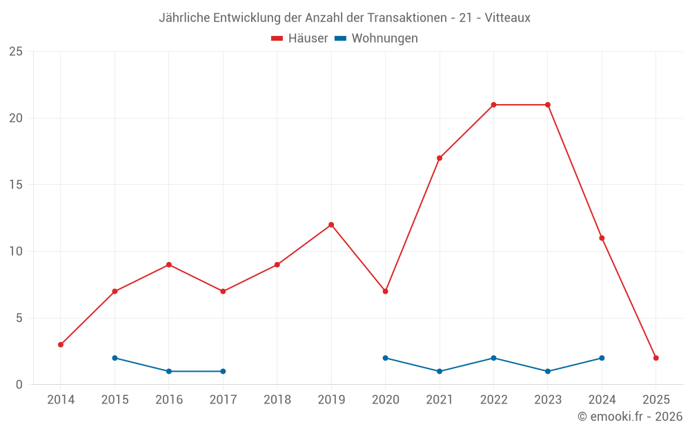 Der Durchschnittspreis auf den 24 Hausgeschäften der letzten 24 Monate in der Gemeinde Vitteaux betrug 938 € pro Quadratmeter für einen mittleren Immobilienwert von 72 000 €. Über diesen Zeitraum hinweg lagen 60% der Transaktionen zwischen 511 und 1 241 € pro Quadratmeter (vom 2. bis zum 8. Dezil).