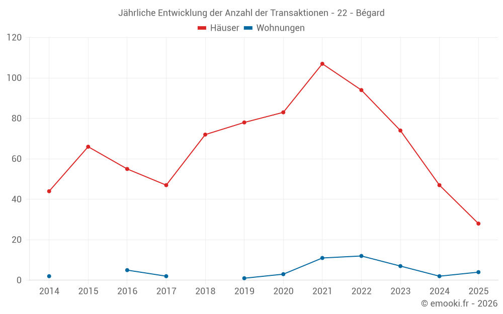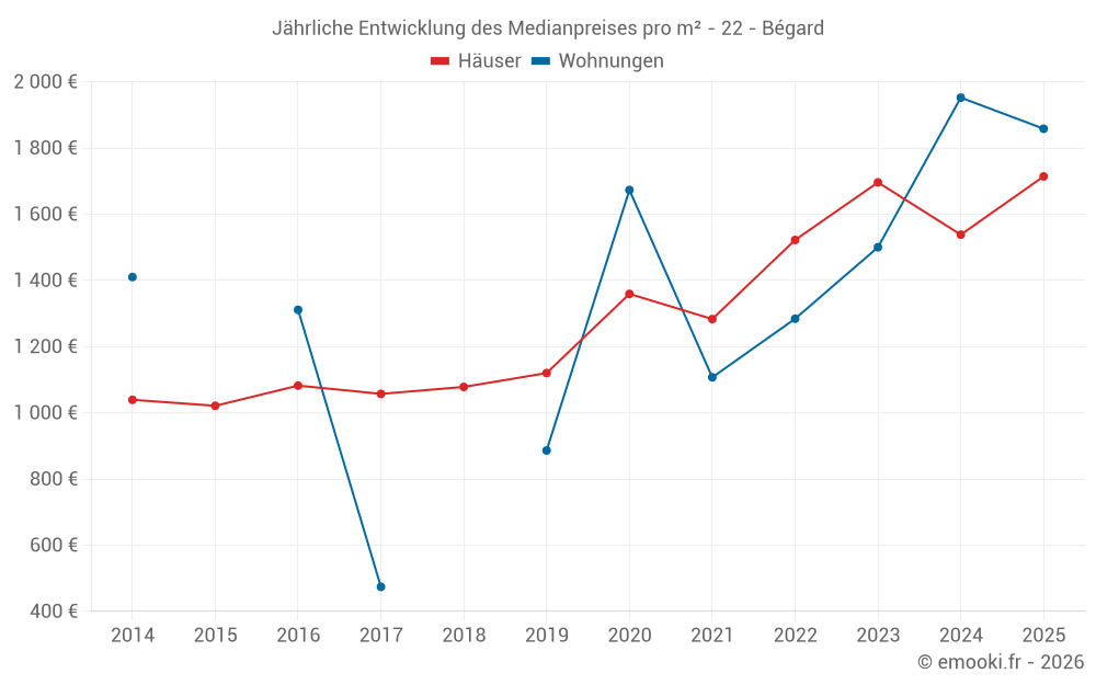 Der Durchschnittspreis auf den 28 Hausgeschäften der letzten 6 Monate in der Gemeinde Bégard betrug 1 714 € pro Quadratmeter für einen mittleren Immobilienwert von 153 500 €. Über diesen Zeitraum hinweg lagen 60% der Transaktionen zwischen 1 218 und 2 025 € pro Quadratmeter (vom 2. bis zum 8. Dezil).