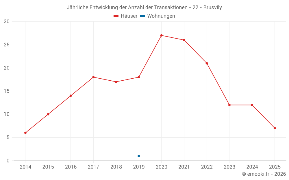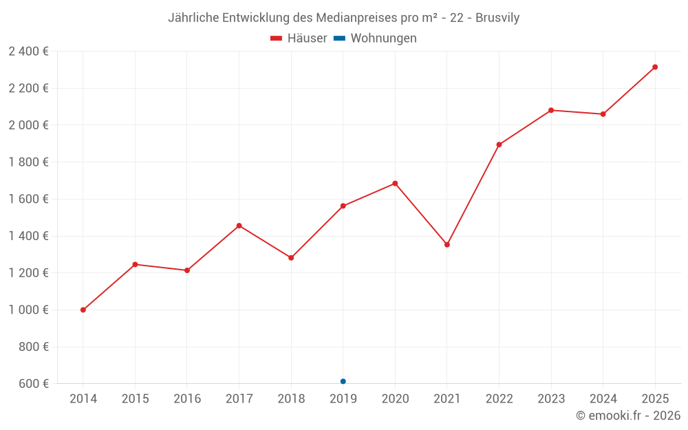 Der Durchschnittspreis auf den 26 Hausgeschäften der letzten 24 Monate in der Gemeinde Brusvily betrug 1 948 € pro Quadratmeter für einen mittleren Immobilienwert von 187 850 €. Über diesen Zeitraum hinweg lagen 60% der Transaktionen zwischen 1 438 und 2 317 € pro Quadratmeter (vom 2. bis zum 8. Dezil).