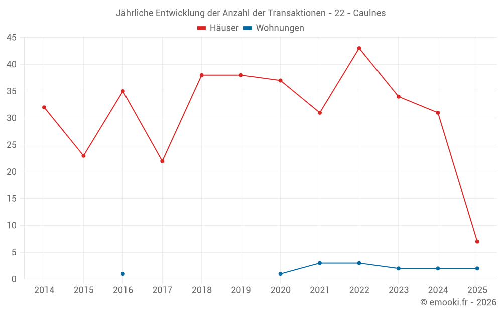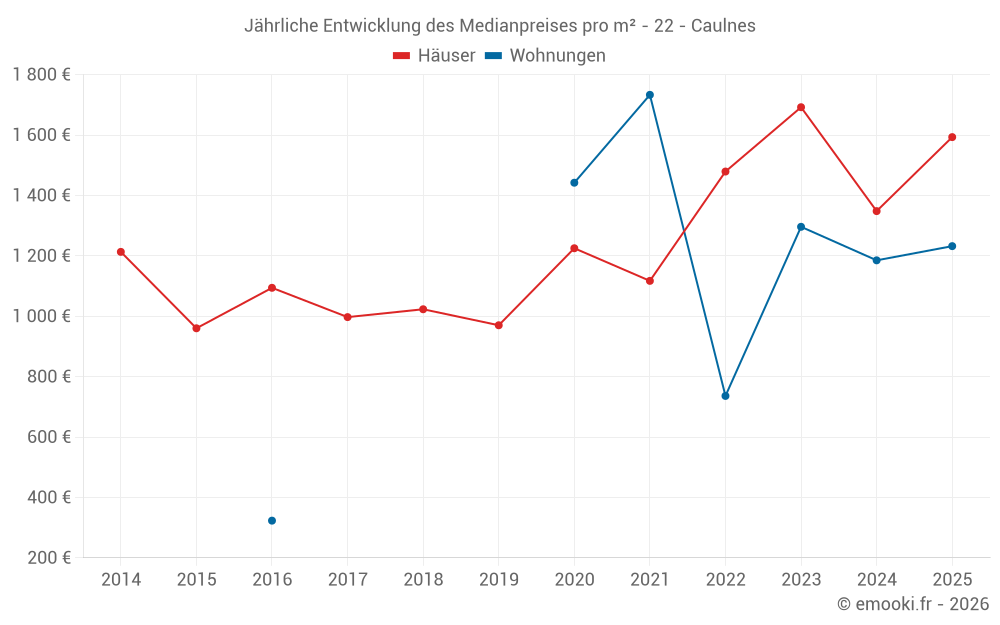 Der Durchschnittspreis auf den 22 Hausgeschäften der letzten 12 Monate in der Gemeinde Caulnes betrug 1 575 € pro Quadratmeter für einen mittleren Immobilienwert von 166 500 €. Über diesen Zeitraum hinweg lagen 60% der Transaktionen zwischen 934 und 2 278 € pro Quadratmeter (vom 2. bis zum 8. Dezil).