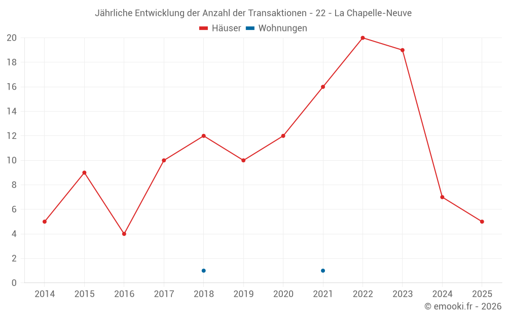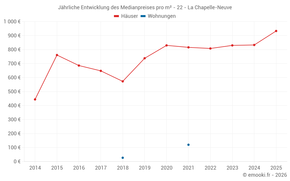 Der Durchschnittspreis auf den 21 Hausgeschäften der letzten 24 Monate in der Gemeinde La Chapelle-Neuve betrug 830 € pro Quadratmeter für einen mittleren Immobilienwert von 72 500 €. Über diesen Zeitraum hinweg lagen 60% der Transaktionen zwischen 393 und 1 094 € pro Quadratmeter (vom 2. bis zum 8. Dezil).