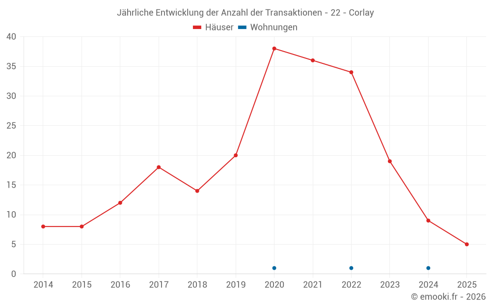 Der Durchschnittspreis auf den 26 Hausgeschäften der letzten 24 Monate in der Gemeinde Corlay betrug 1 068 € pro Quadratmeter für einen mittleren Immobilienwert von 122 500 €. Über diesen Zeitraum hinweg lagen 60% der Transaktionen zwischen 673 und 1 648 € pro Quadratmeter (vom 2. bis zum 8. Dezil).