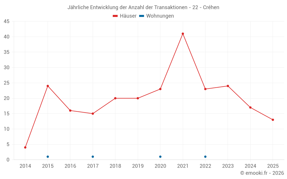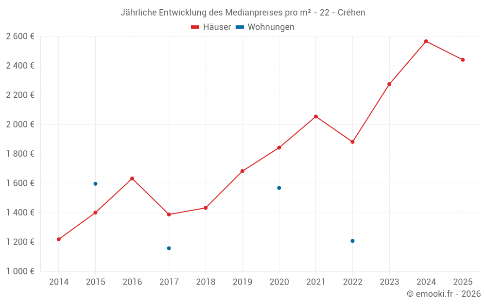 Der Durchschnittspreis auf den 22 Hausgeschäften der letzten 12 Monate in der Gemeinde Créhen betrug 2 456 € pro Quadratmeter für einen mittleren Immobilienwert von 235 000 €. Über diesen Zeitraum hinweg lagen 60% der Transaktionen zwischen 1 869 und 2 784 € pro Quadratmeter (vom 2. bis zum 8. Dezil).