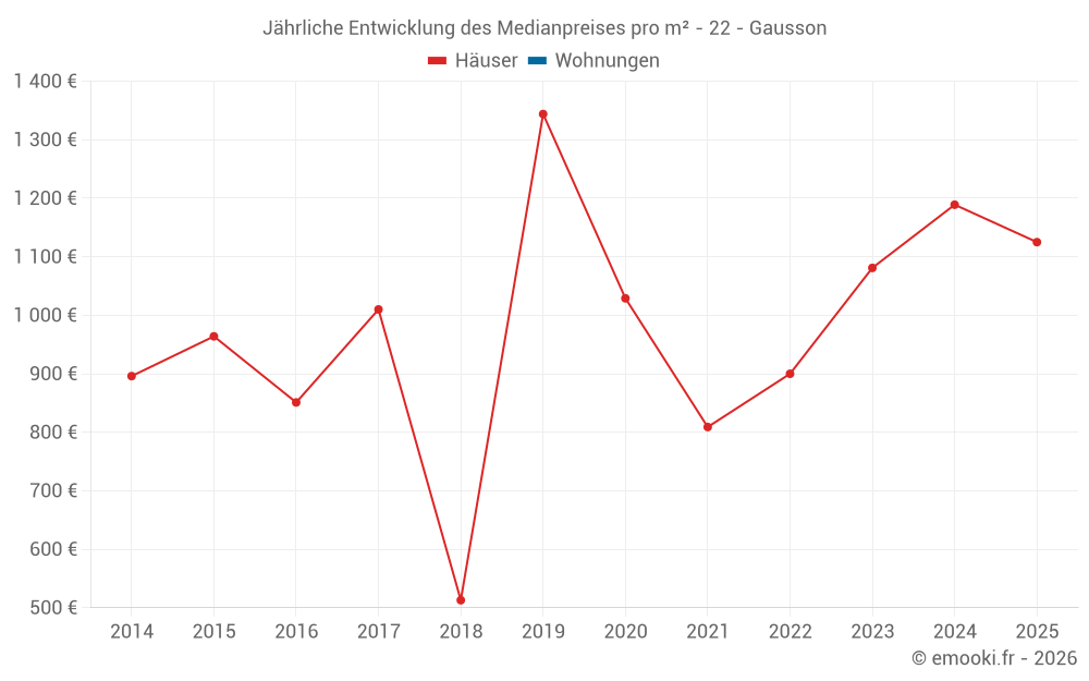 Der Durchschnittspreis auf den 16 Hausgeschäften der letzten 24 Monate in der Gemeinde Gausson betrug 1 180 € pro Quadratmeter für einen mittleren Immobilienwert von 100 050 €. Über diesen Zeitraum hinweg lagen 60% der Transaktionen zwischen 716 und 1 500 € pro Quadratmeter (vom 2. bis zum 8. Dezil).
