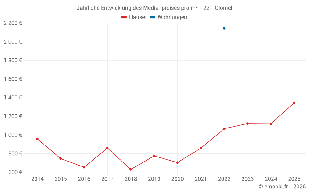 Der Durchschnittspreis auf den 18 Hausgeschäften der letzten 6 Monate in der Gemeinde Glomel betrug 1 345 € pro Quadratmeter für einen mittleren Immobilienwert von 112 250 €. Über diesen Zeitraum hinweg lagen 60% der Transaktionen zwischen 778 und 1 847 € pro Quadratmeter (vom 2. bis zum 8. Dezil).