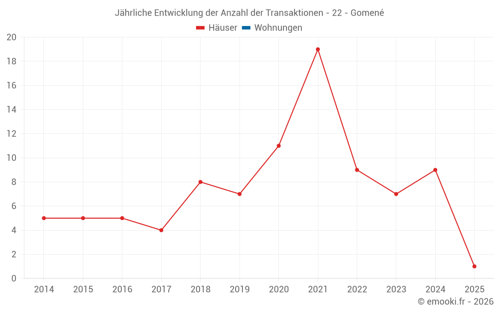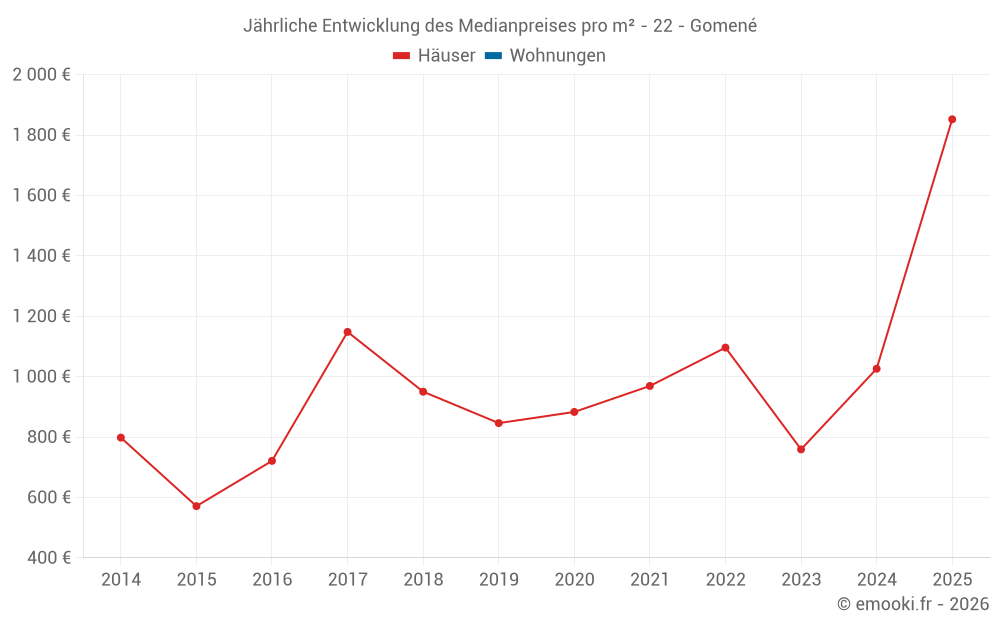 Der Durchschnittspreis auf den 14 Hausgeschäften der letzten 24 Monate in der Gemeinde Gomené betrug 1 186 € pro Quadratmeter für einen mittleren Immobilienwert von 113 650 €. Über diesen Zeitraum hinweg lagen 60% der Transaktionen zwischen 647 und 1 686 € pro Quadratmeter (vom 2. bis zum 8. Dezil).