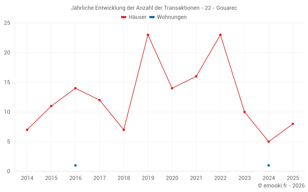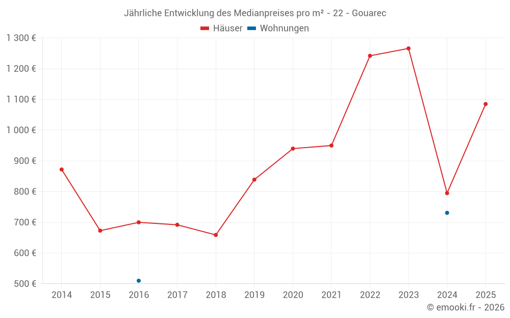Der Durchschnittspreis auf den 18 Hausgeschäften der letzten 24 Monate in der Gemeinde Gouarec betrug 1 200 € pro Quadratmeter für einen mittleren Immobilienwert von 115 000 €. Über diesen Zeitraum hinweg lagen 60% der Transaktionen zwischen 849 und 1 460 € pro Quadratmeter (vom 2. bis zum 8. Dezil).