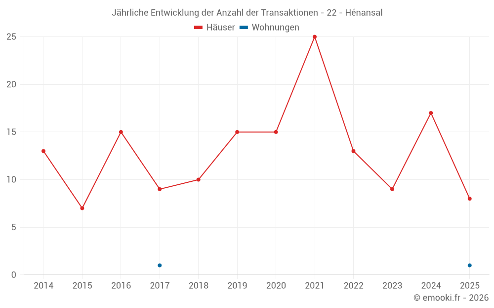 Der Durchschnittspreis auf den 17 Hausgeschäften der letzten 12 Monate in der Gemeinde Hénansal betrug 1 667 € pro Quadratmeter für einen mittleren Immobilienwert von 200 000 €. Über diesen Zeitraum hinweg lagen 60% der Transaktionen zwischen 1 215 und 2 410 € pro Quadratmeter (vom 2. bis zum 8. Dezil).