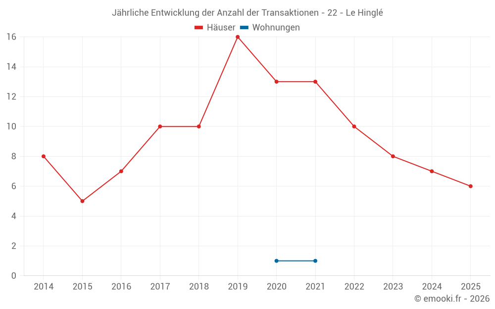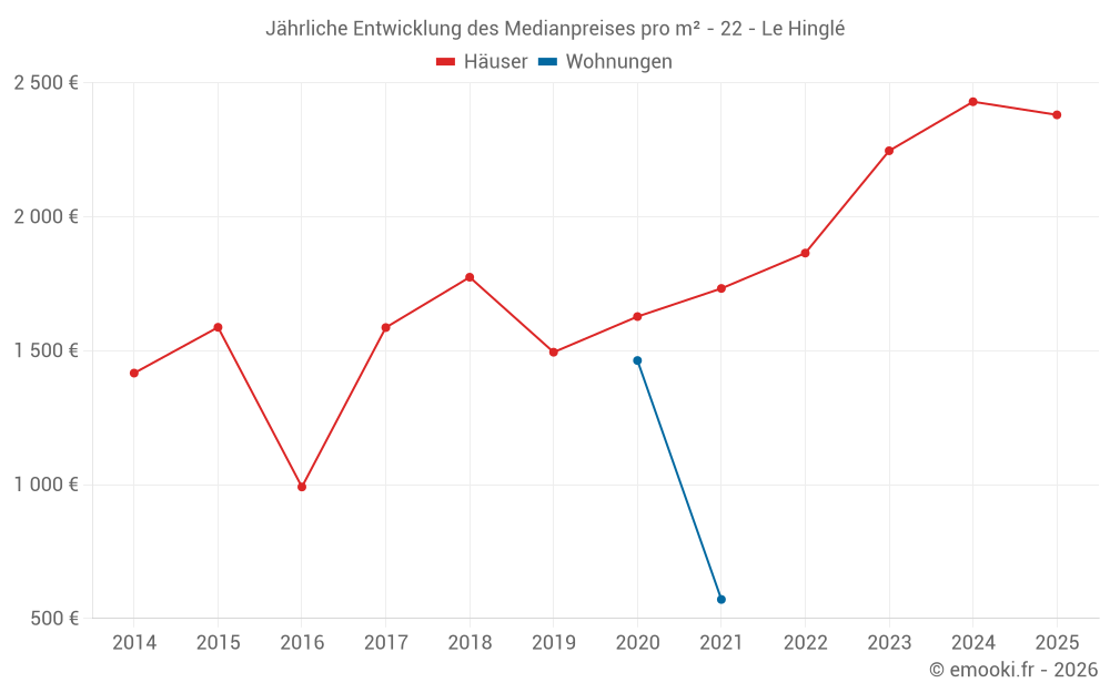 Der Durchschnittspreis auf den 19 Hausgeschäften der letzten 24 Monate in der Gemeinde Le Hinglé betrug 2 429 € pro Quadratmeter für einen mittleren Immobilienwert von 239 000 €. Über diesen Zeitraum hinweg lagen 60% der Transaktionen zwischen 1 982 und 3 064 € pro Quadratmeter (vom 2. bis zum 8. Dezil).