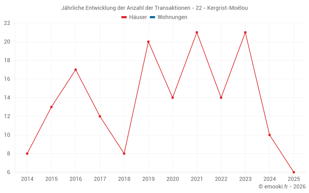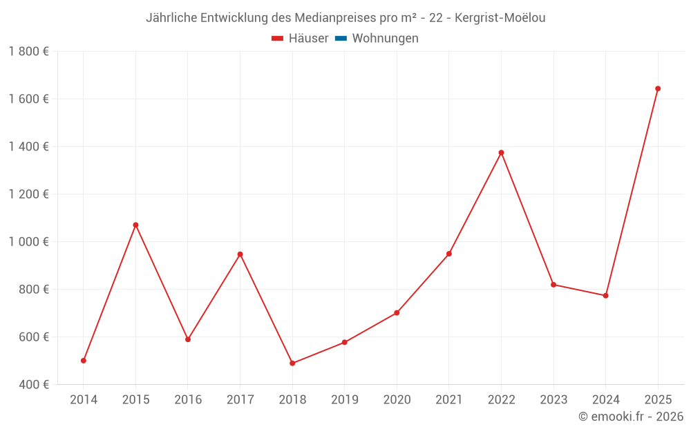 Der Durchschnittspreis auf den 24 Hausgeschäften der letzten 24 Monate in der Gemeinde Kergrist-Moëlou betrug 854 € pro Quadratmeter für einen mittleren Immobilienwert von 81 000 €. Über diesen Zeitraum hinweg lagen 60% der Transaktionen zwischen 655 und 1 499 € pro Quadratmeter (vom 2. bis zum 8. Dezil).