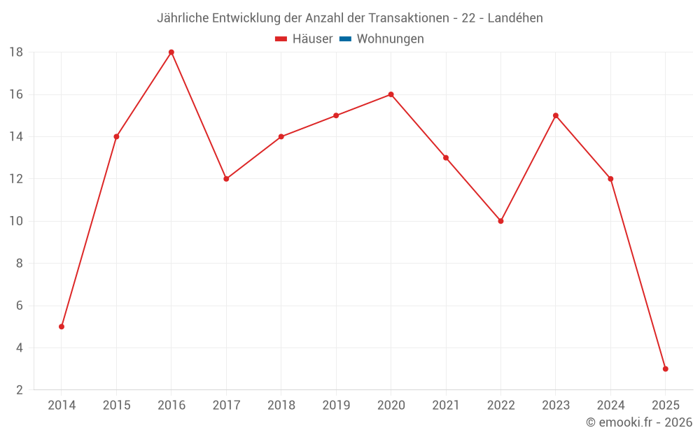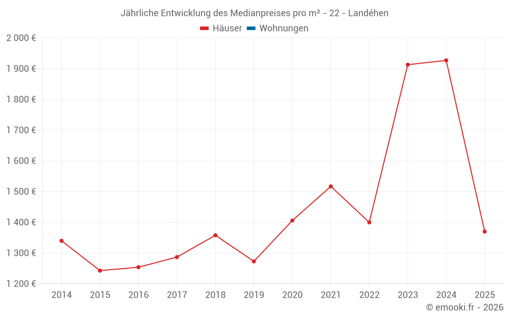 Der Durchschnittspreis auf den 23 Hausgeschäften der letzten 24 Monate in der Gemeinde Landéhen betrug 1 932 € pro Quadratmeter für einen mittleren Immobilienwert von 205 660 €. Über diesen Zeitraum hinweg lagen 60% der Transaktionen zwischen 1 624 und 2 357 € pro Quadratmeter (vom 2. bis zum 8. Dezil).