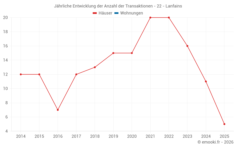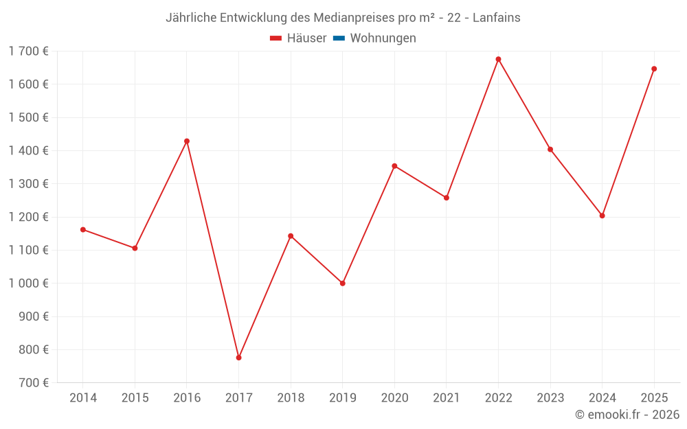 Der Durchschnittspreis auf den 27 Hausgeschäften der letzten 24 Monate in der Gemeinde Lanfains betrug 1 471 € pro Quadratmeter für einen mittleren Immobilienwert von 126 750 €. Über diesen Zeitraum hinweg lagen 60% der Transaktionen zwischen 740 und 1 784 € pro Quadratmeter (vom 2. bis zum 8. Dezil).