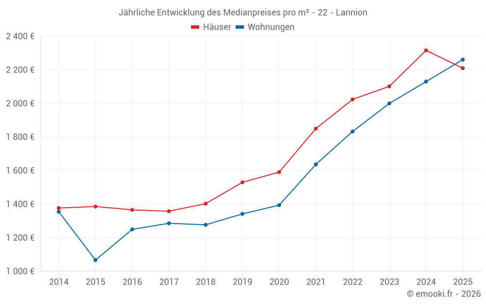 Der Durchschnittspreis auf den 36 Wohnungstransaktionen der letzten 6 Monate in der Gemeinde Lannion betrug 2 261 € pro Quadratmeter für einen mittleren Immobilienwert von 115 000 €. Über diesen Zeitraum hinweg lagen 60% der Transaktionen zwischen 1 702 und 2 893 € pro Quadratmeter (vom 2. bis zum 8. Dezil).