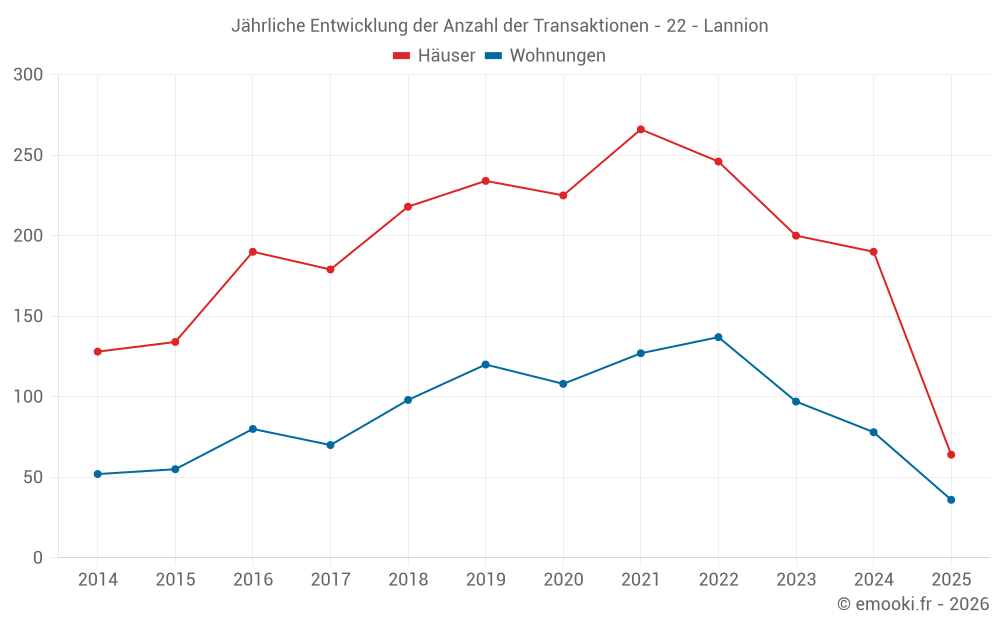 Der Durchschnittspreis auf den 28 Hausgeschäften der letzten 3 Monate in der Gemeinde Lannion betrug 1 907 € pro Quadratmeter für einen mittleren Immobilienwert von 153 185 €. Über diesen Zeitraum hinweg lagen 60% der Transaktionen zwischen 1 479 und 2 393 € pro Quadratmeter (vom 2. bis zum 8. Dezil).