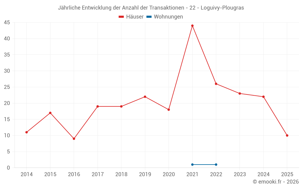 Der Durchschnittspreis auf den 22 Hausgeschäften der letzten 12 Monate in der Gemeinde Loguivy-Plougras betrug 1 068 € pro Quadratmeter für einen mittleren Immobilienwert von 85 000 €. Über diesen Zeitraum hinweg lagen 60% der Transaktionen zwischen 714 und 1 689 € pro Quadratmeter (vom 2. bis zum 8. Dezil).