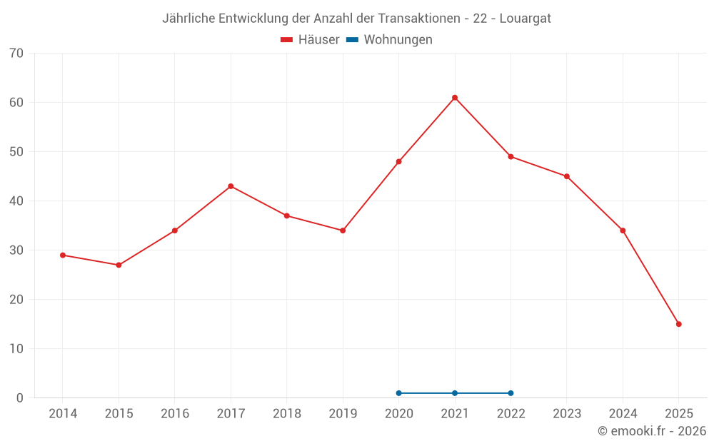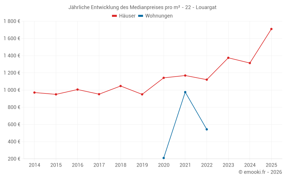 Der Durchschnittspreis auf den 38 Hausgeschäften der letzten 12 Monate in der Gemeinde Louargat betrug 1 516 € pro Quadratmeter für einen mittleren Immobilienwert von 144 000 €. Über diesen Zeitraum hinweg lagen 60% der Transaktionen zwischen 817 und 2 336 € pro Quadratmeter (vom 2. bis zum 8. Dezil).