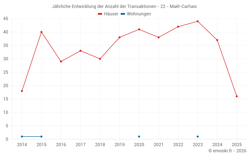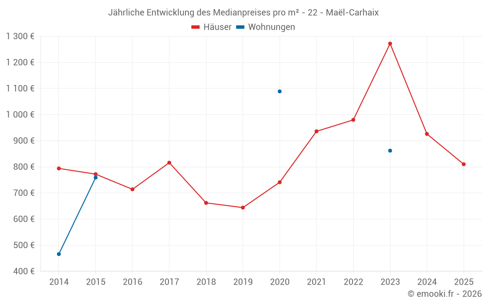 Der Durchschnittspreis auf den 33 Hausgeschäften der letzten 12 Monate in der Gemeinde Maël-Carhaix betrug 1 020 € pro Quadratmeter für einen mittleren Immobilienwert von 85 000 €. Über diesen Zeitraum hinweg lagen 60% der Transaktionen zwischen 606 und 1 383 € pro Quadratmeter (vom 2. bis zum 8. Dezil).