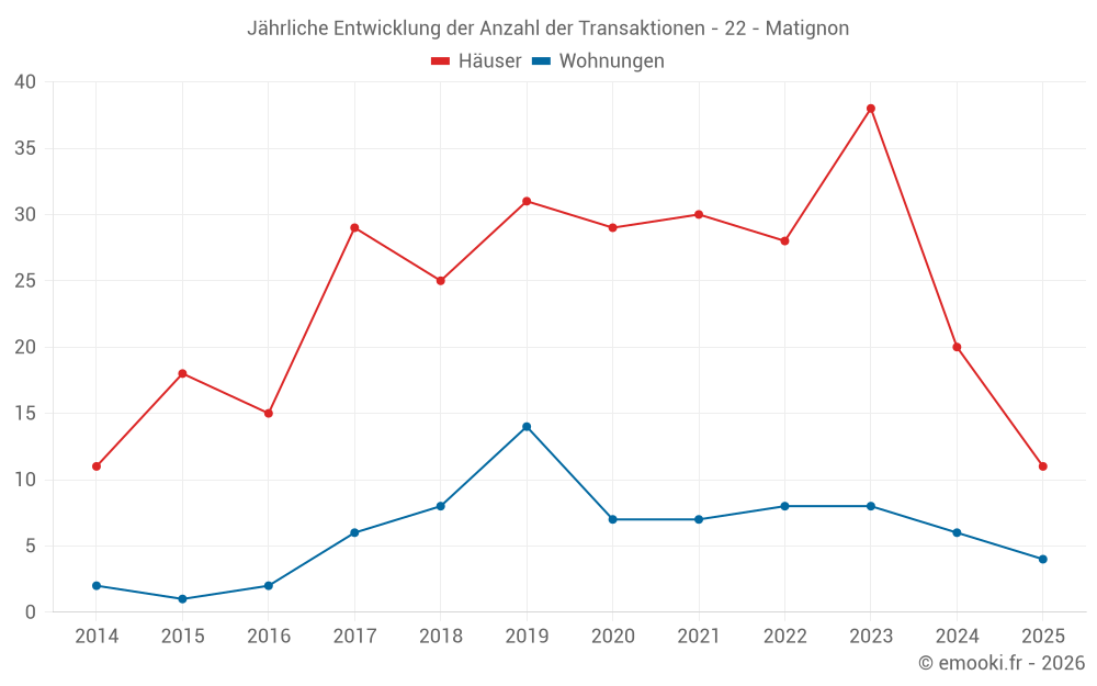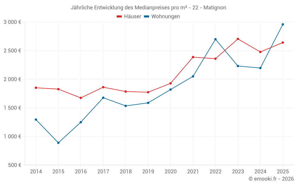 Der Durchschnittspreis auf den 21 Hausgeschäften der letzten 12 Monate in der Gemeinde Matignon betrug 2 473 € pro Quadratmeter für einen mittleren Immobilienwert von 235 000 €. Über diesen Zeitraum hinweg lagen 60% der Transaktionen zwischen 2 029 und 3 182 € pro Quadratmeter (vom 2. bis zum 8. Dezil).