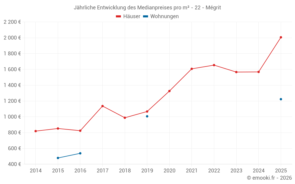 Der Durchschnittspreis auf den 25 Hausgeschäften der letzten 24 Monate in der Gemeinde Mégrit betrug 1 690 € pro Quadratmeter für einen mittleren Immobilienwert von 155 631 €. Über diesen Zeitraum hinweg lagen 60% der Transaktionen zwischen 1 169 und 1 952 € pro Quadratmeter (vom 2. bis zum 8. Dezil).