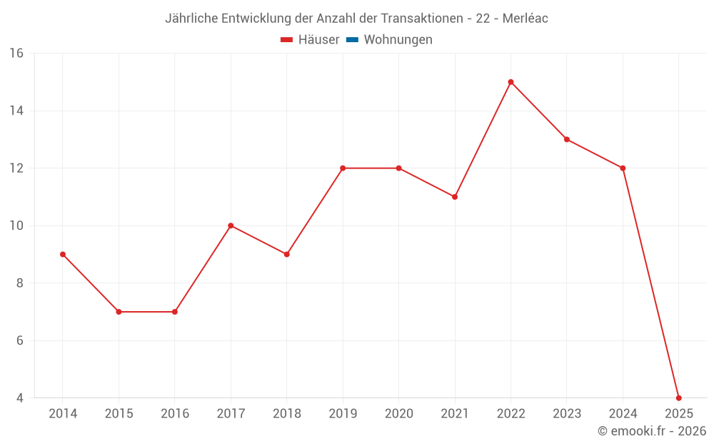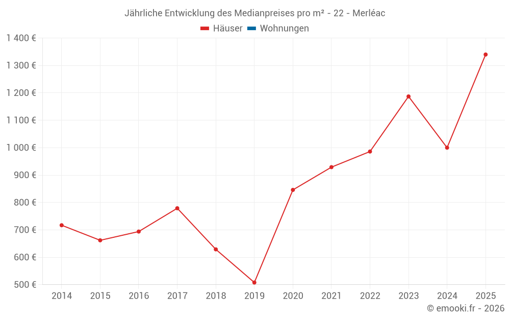 Der Durchschnittspreis auf den 19 Hausgeschäften der letzten 24 Monate in der Gemeinde Merléac betrug 1 000 € pro Quadratmeter für einen mittleren Immobilienwert von 105 000 €. Über diesen Zeitraum hinweg lagen 60% der Transaktionen zwischen 715 und 1 329 € pro Quadratmeter (vom 2. bis zum 8. Dezil).