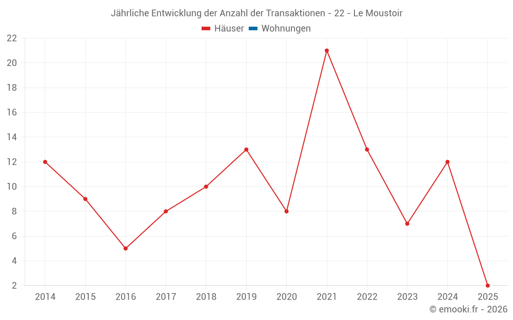 Der Durchschnittspreis auf den 20 Hausgeschäften der letzten 24 Monate in der Gemeinde Le Moustoir betrug 1 207 € pro Quadratmeter für einen mittleren Immobilienwert von 115 000 €. Über diesen Zeitraum hinweg lagen 60% der Transaktionen zwischen 878 und 1 671 € pro Quadratmeter (vom 2. bis zum 8. Dezil).