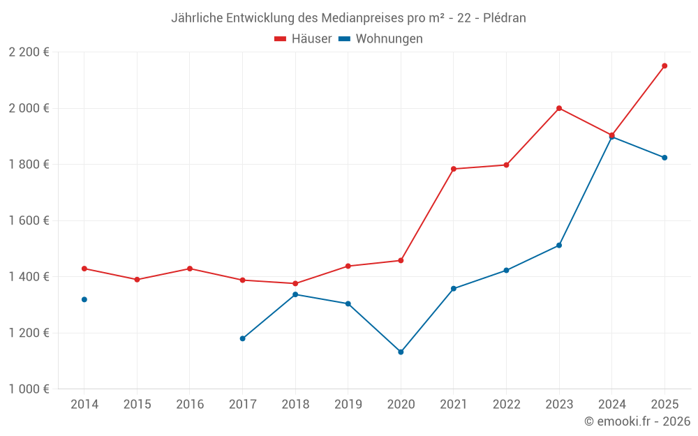 Der Durchschnittspreis auf den 31 Hausgeschäften der letzten 6 Monate in der Gemeinde Plédran betrug 2 151 € pro Quadratmeter für einen mittleren Immobilienwert von 197 000 €. Über diesen Zeitraum hinweg lagen 60% der Transaktionen zwischen 1 486 und 2 671 € pro Quadratmeter (vom 2. bis zum 8. Dezil).