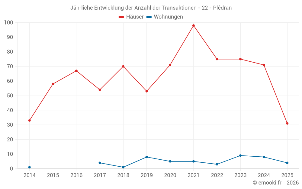 Der Durchschnittspreis auf den 17 Wohnungstransaktionen der letzten 24 Monate in der Gemeinde Plédran betrug 1 750 € pro Quadratmeter für einen mittleren Immobilienwert von 77 900 €. Über diesen Zeitraum hinweg lagen 60% der Transaktionen zwischen 1 528 und 1 909 € pro Quadratmeter (vom 2. bis zum 8. Dezil).