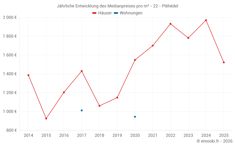 Der Durchschnittspreis auf den 25 Hausgeschäften der letzten 24 Monate in der Gemeinde Pléhédel betrug 1 793 € pro Quadratmeter für einen mittleren Immobilienwert von 165 050 €. Über diesen Zeitraum hinweg lagen 60% der Transaktionen zwischen 1 472 und 2 243 € pro Quadratmeter (vom 2. bis zum 8. Dezil).